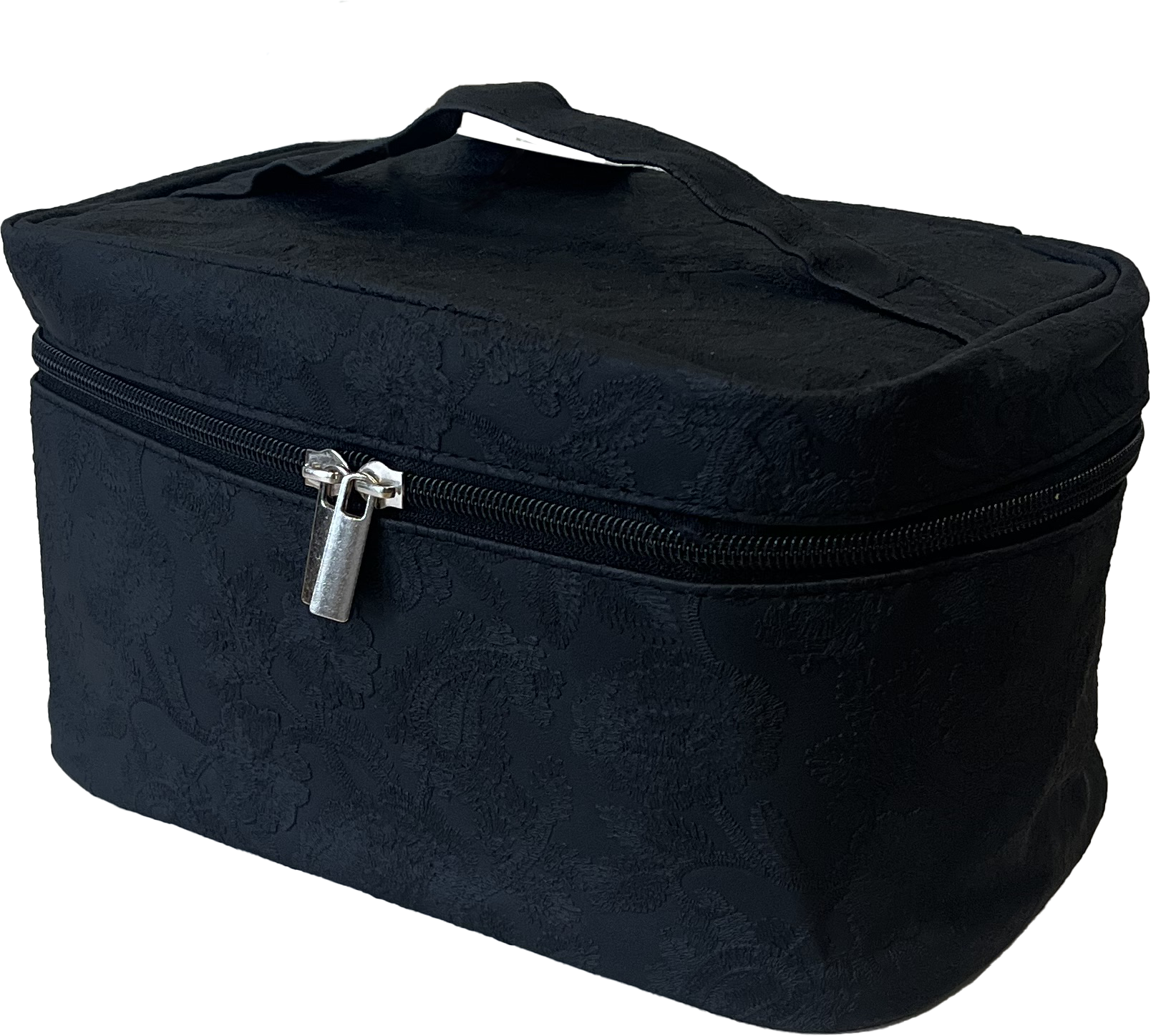 Stilren necessär i svart spetsmönster med stabil botten och