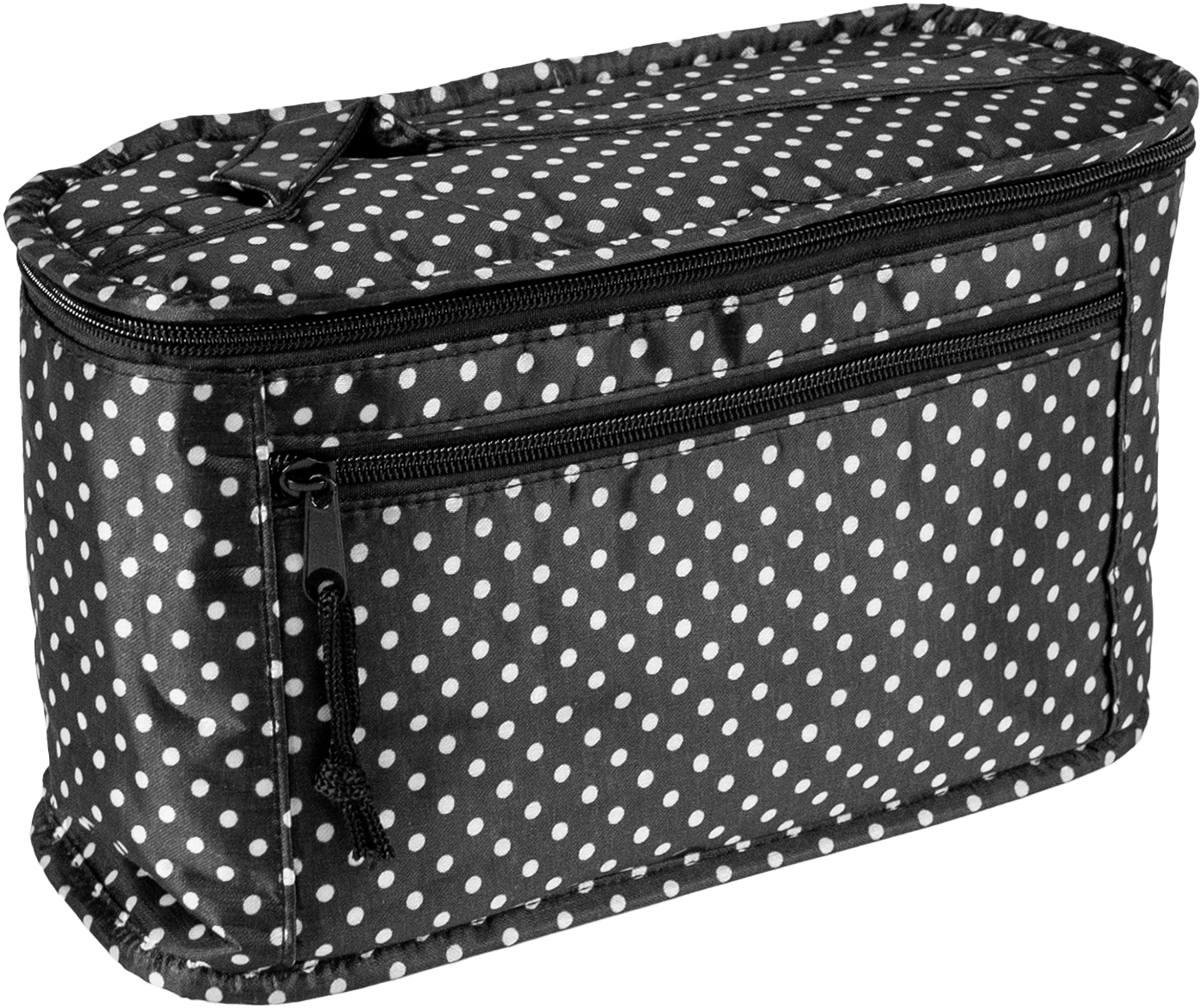 Stor och praktisk necessär med flera fack, spegel och stabil botten. Smidigt handtag så att du får med dig din necessär dit resan tar dig. Utsida i microfiber och insidan i polyester. Storlek 29x19x13cm. Färg: Svart med vita prickar.