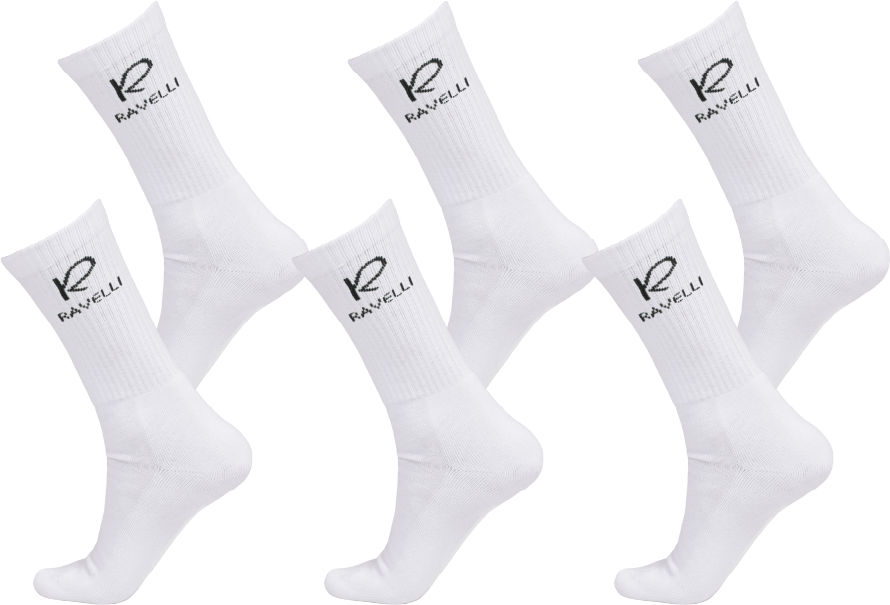 6-pack klassiska tubsockor, 6 par vita Passar lika bra till träning som till vardags. RAVELLI logga på skaftet av strumpan.