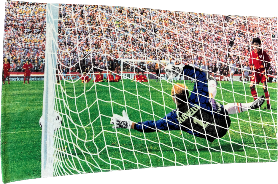 Exklusiv handduk med motiv från Thomas Ravellis legendariska räddning i VM 1994 – ett ögonblick som etsats fast i svensk fotbollshistoria. Designen är unik, har aldrig tidigare producerats och ges ut i en begränsad upplaga.